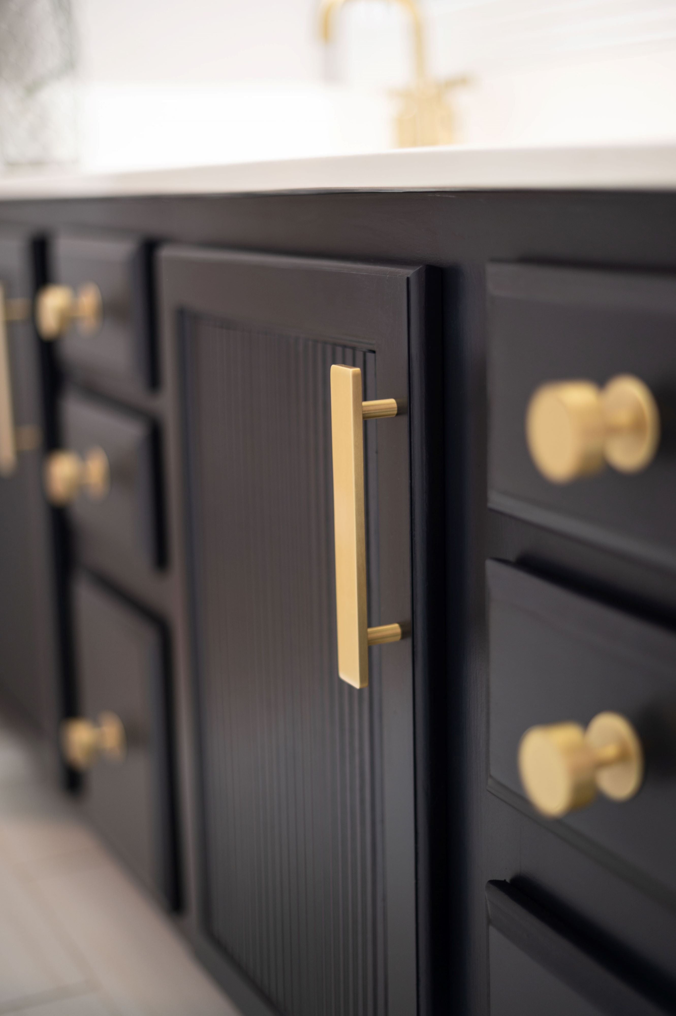See Bold KnobsBold, knurled black and brushed brass knobs perfectly coordinate with Bold pulls