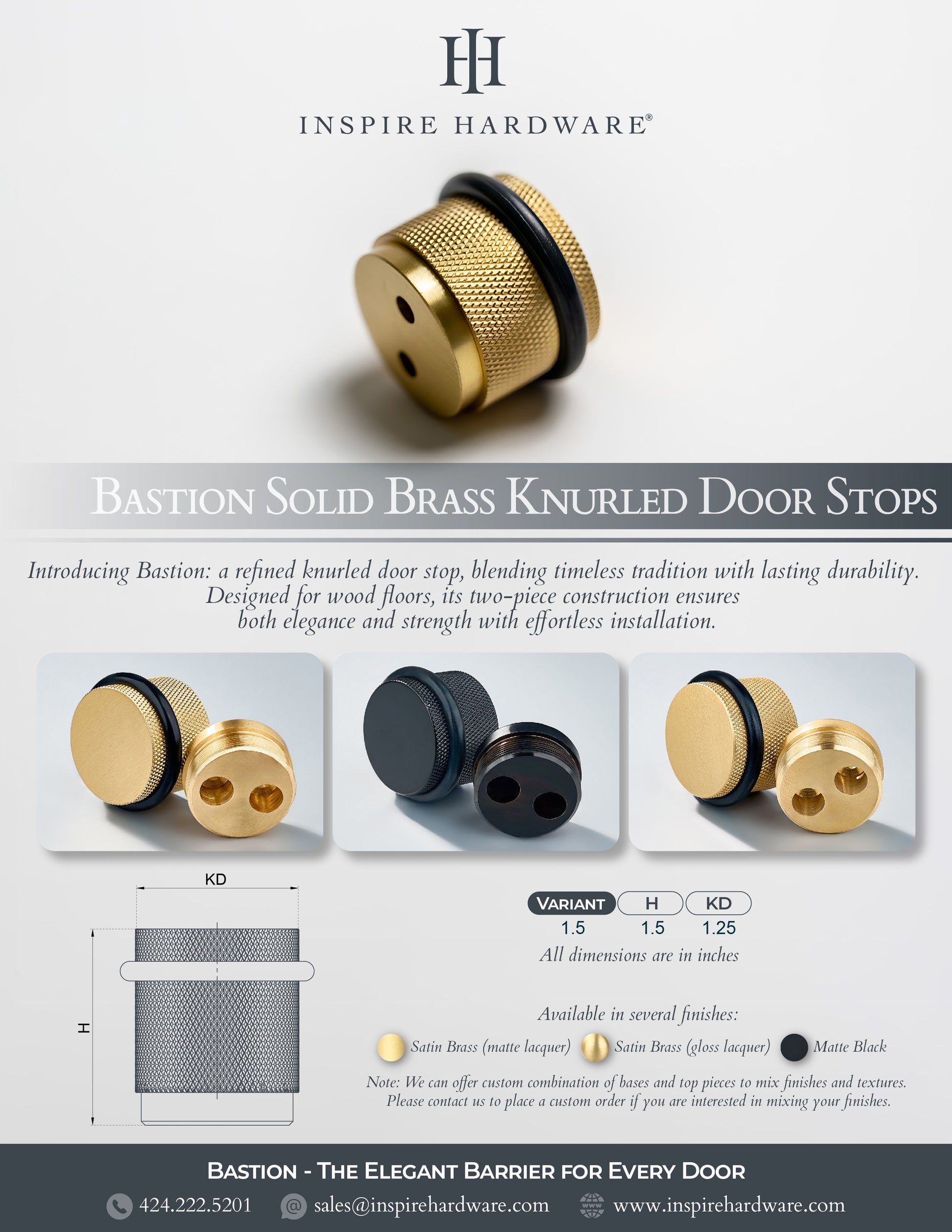 Introducing Bastion, our collection of traditional, linear, and ring knurled door stops. These feature an elegantly simple installation design where the base piece screws into the floor and the top piece threads in to create a very sturdy barrier at any location. As we only provide wood screws, this line is meant for wood floors.