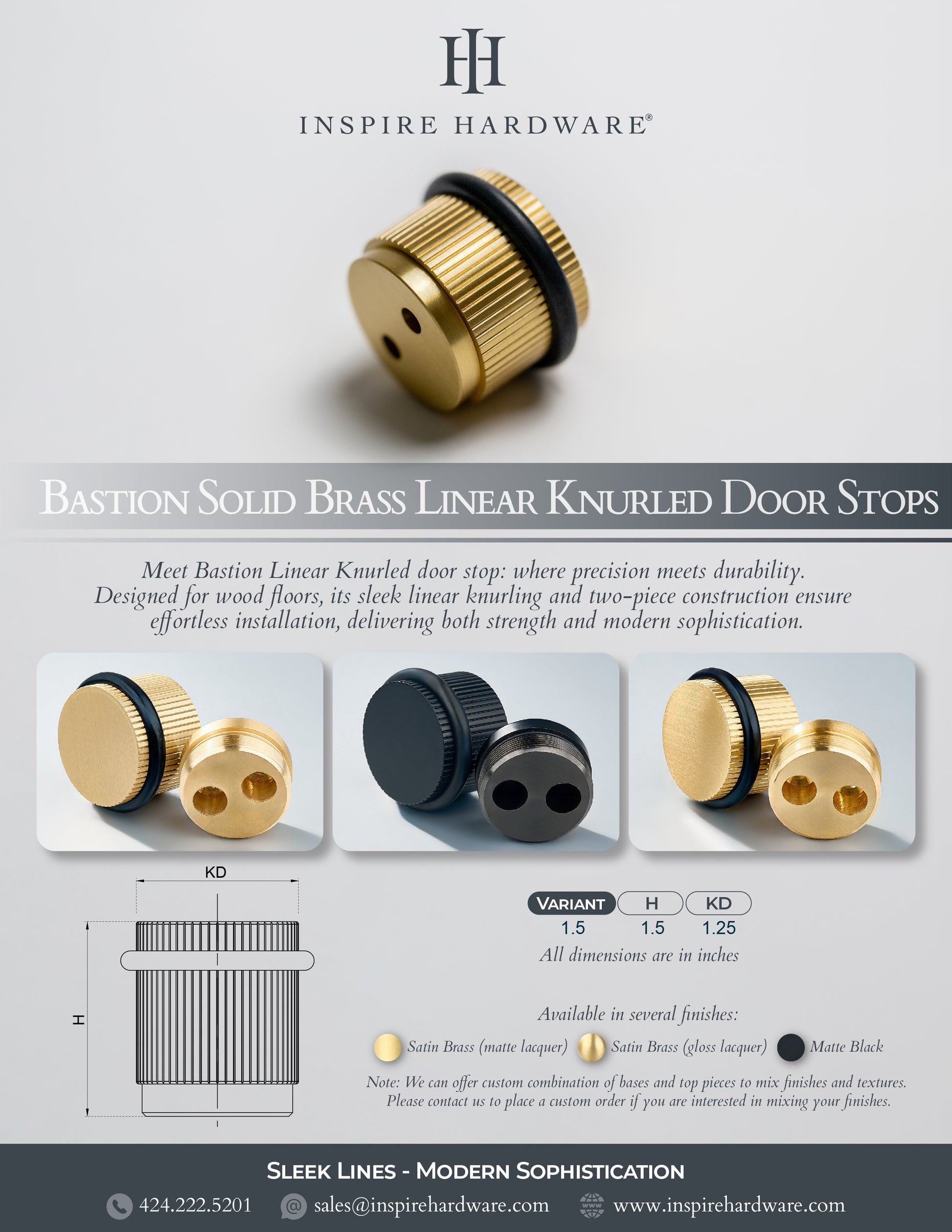 Introducing Bastion, our collection of traditional, linear, and ring knurled door stops. These feature an elegantly simple installation design where the base piece screws into the floor and the top piece threads in to create a very sturdy barrier at any location. As we only provide wood screws, this line is meant for wood floors.